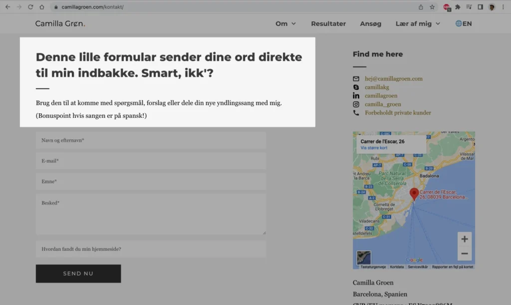 I stedet for blot at skrive, “udfyld formularen nedenfor hvis du er interesseret i et samarbejde”, tager hun dig igennem en række spørgsmål – fx om hvilken branche du arbejder indenfor, og hvilke ydelser du er interesseret i.